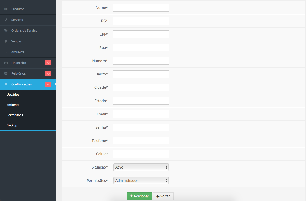 Aqui abaixo vamos aprender a adicionar usuários no sistema e bem fácil de fazer , bastando seguir os passos abaixo , basta ir em configurações e depois em usuários que ira aparecer esta imagem abaixo você ira clicar em adicionar usuário