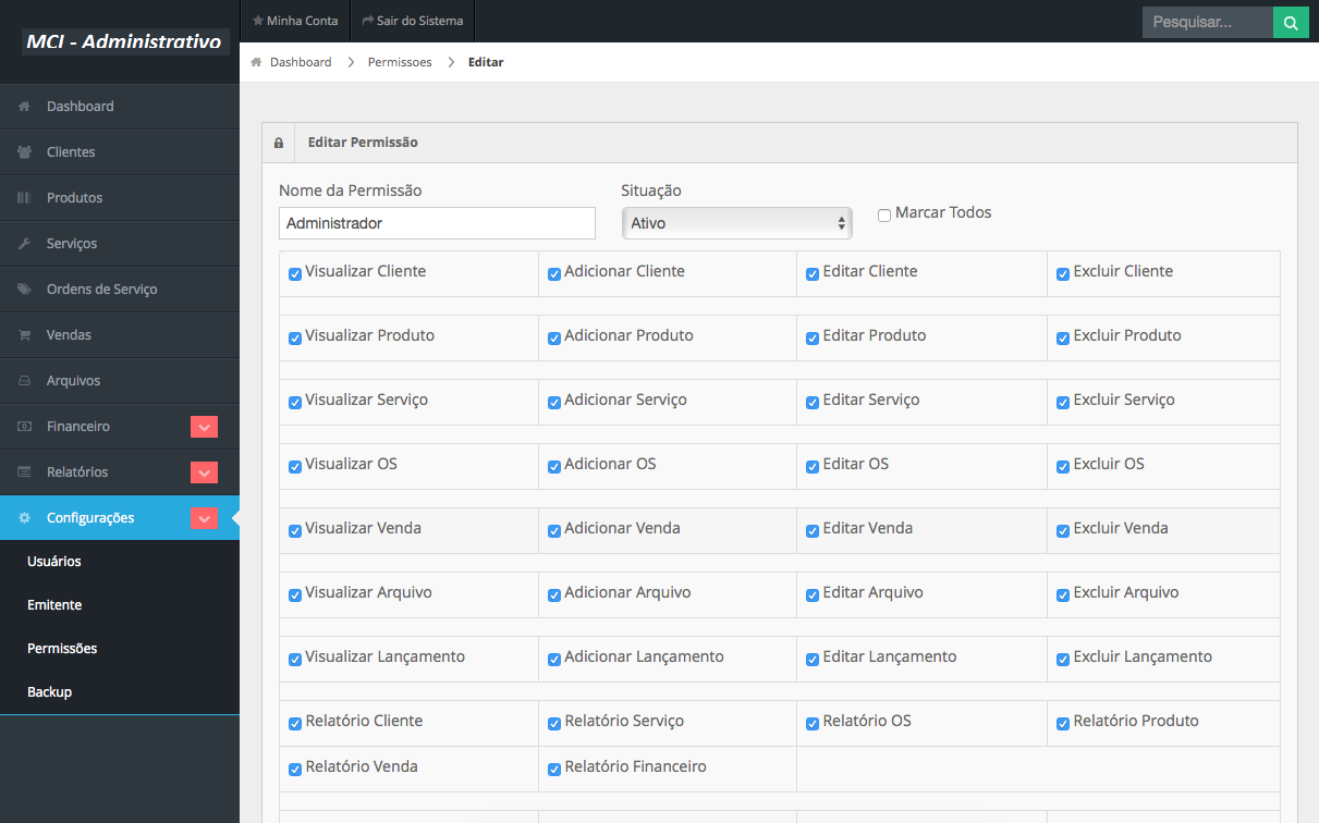 logo depois iremos dar as permissões para esse usuário marcando o que ele pode ou não fazer no sistema , na tela abaixo ira aparecer os usuários que você crio mas não modifique a do administrador , e vital que não mude nada na conta de administrador , as contas que você crio vão aparecer e você clique no ícone da canetinha do usuário que quer modificar ou seja a que você acabo de cria